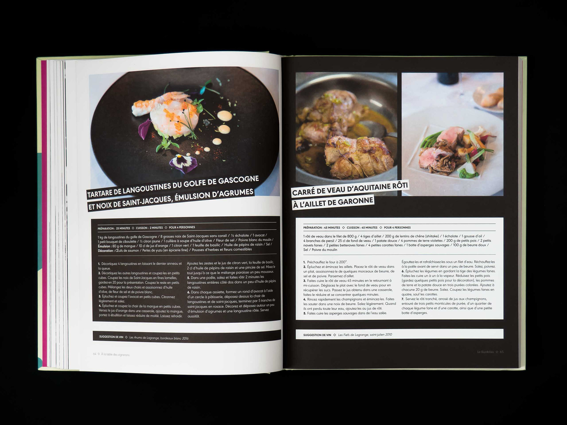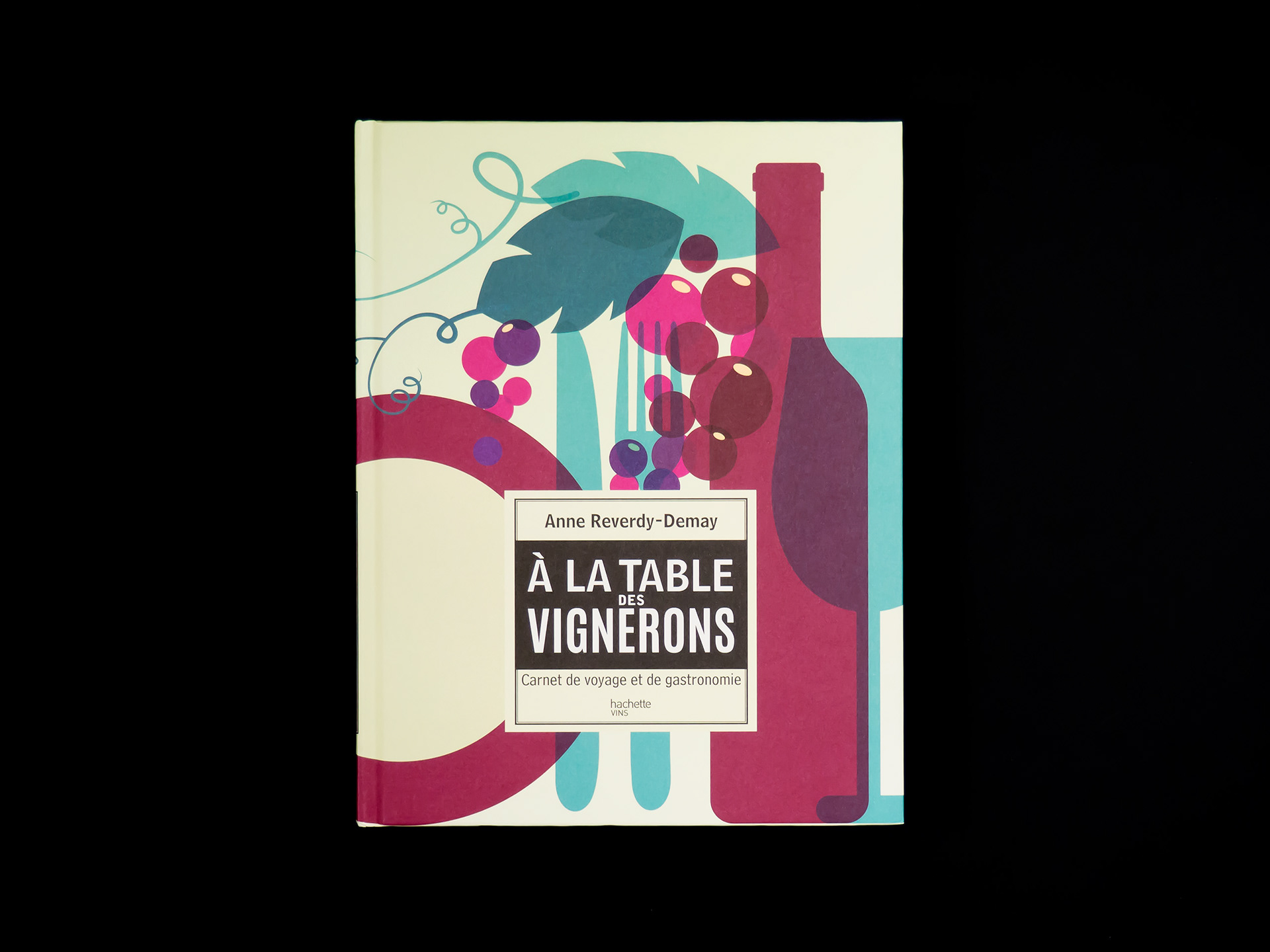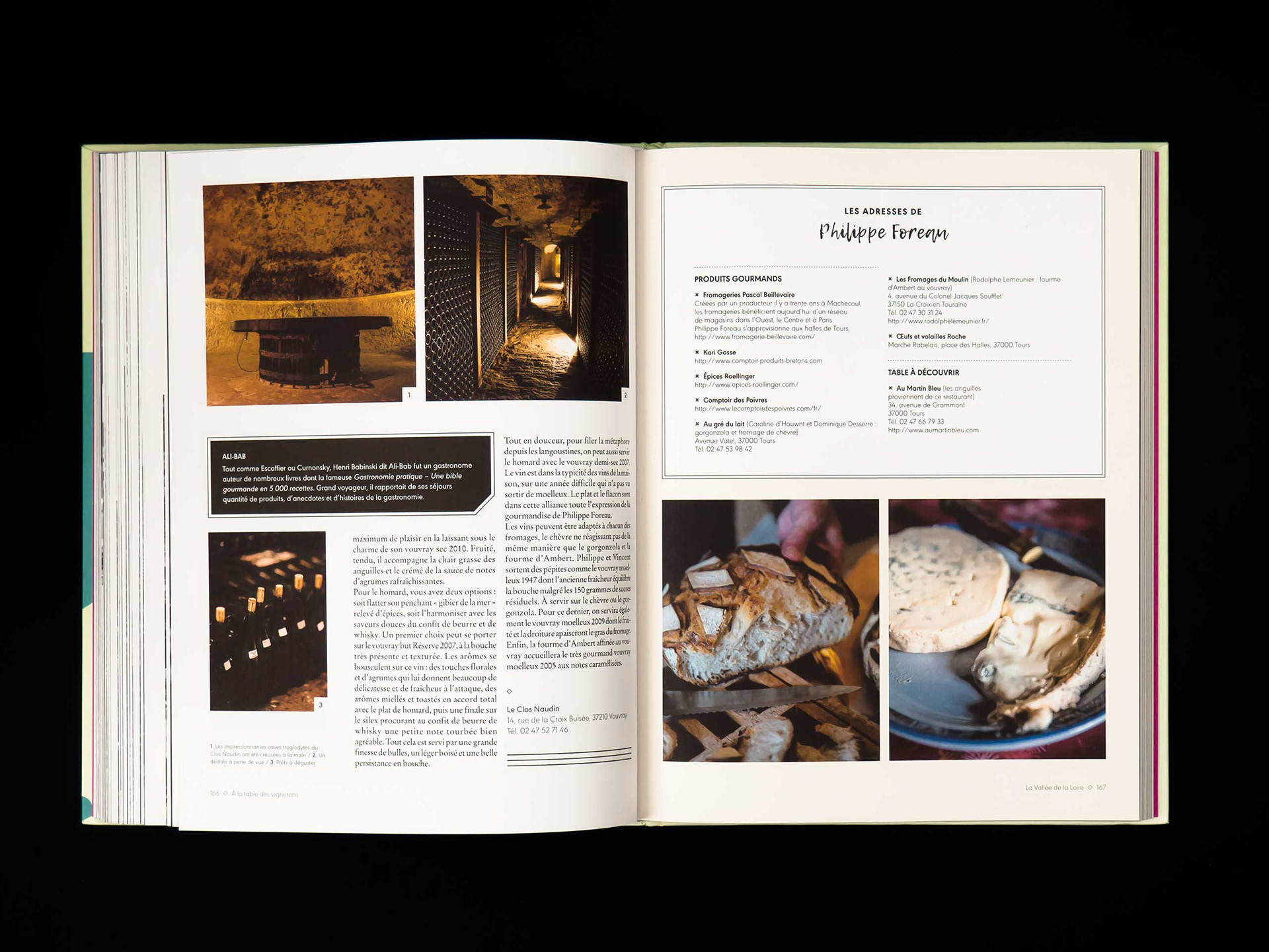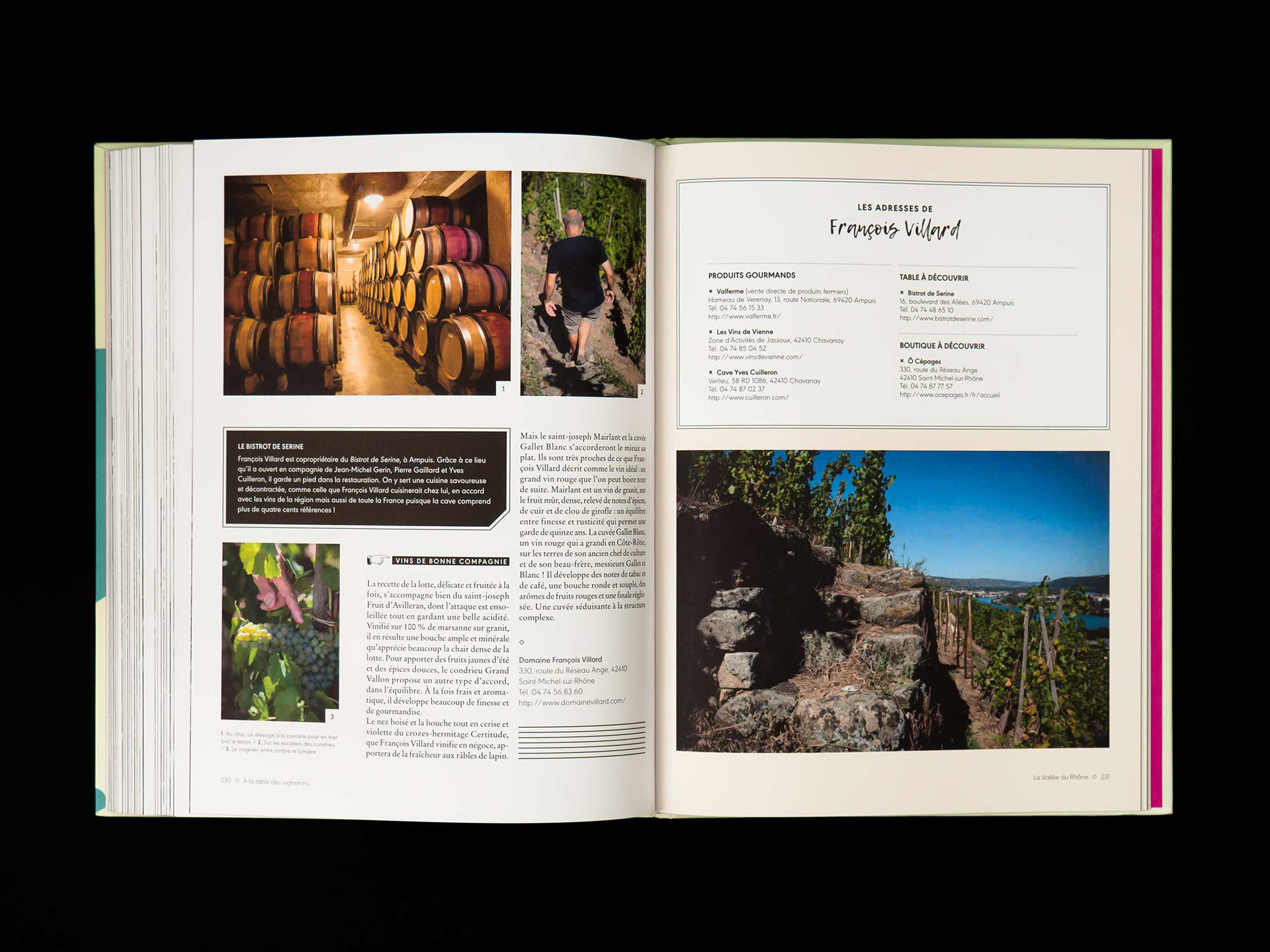 Conception et réalisation de la mise en pages d’un carnet de voyage gastronomique autour de la vigne. Relié cartonné, 256 pages.