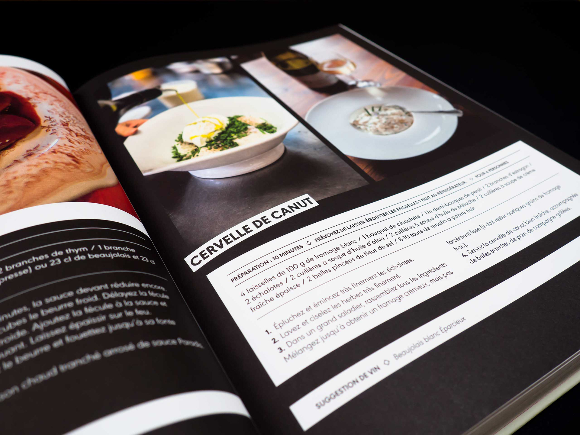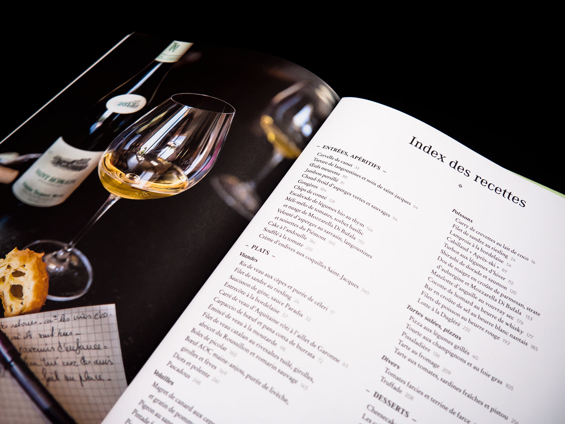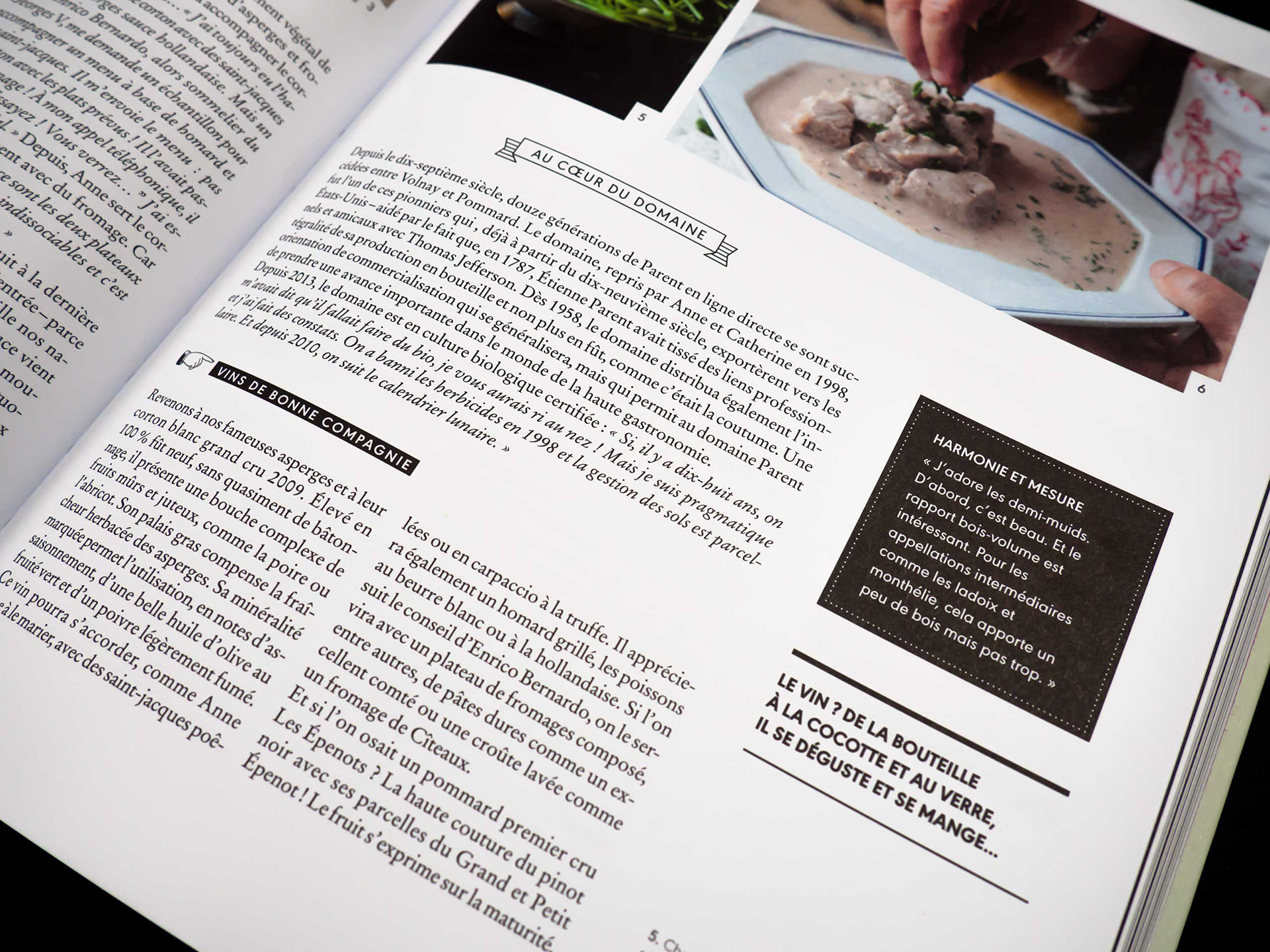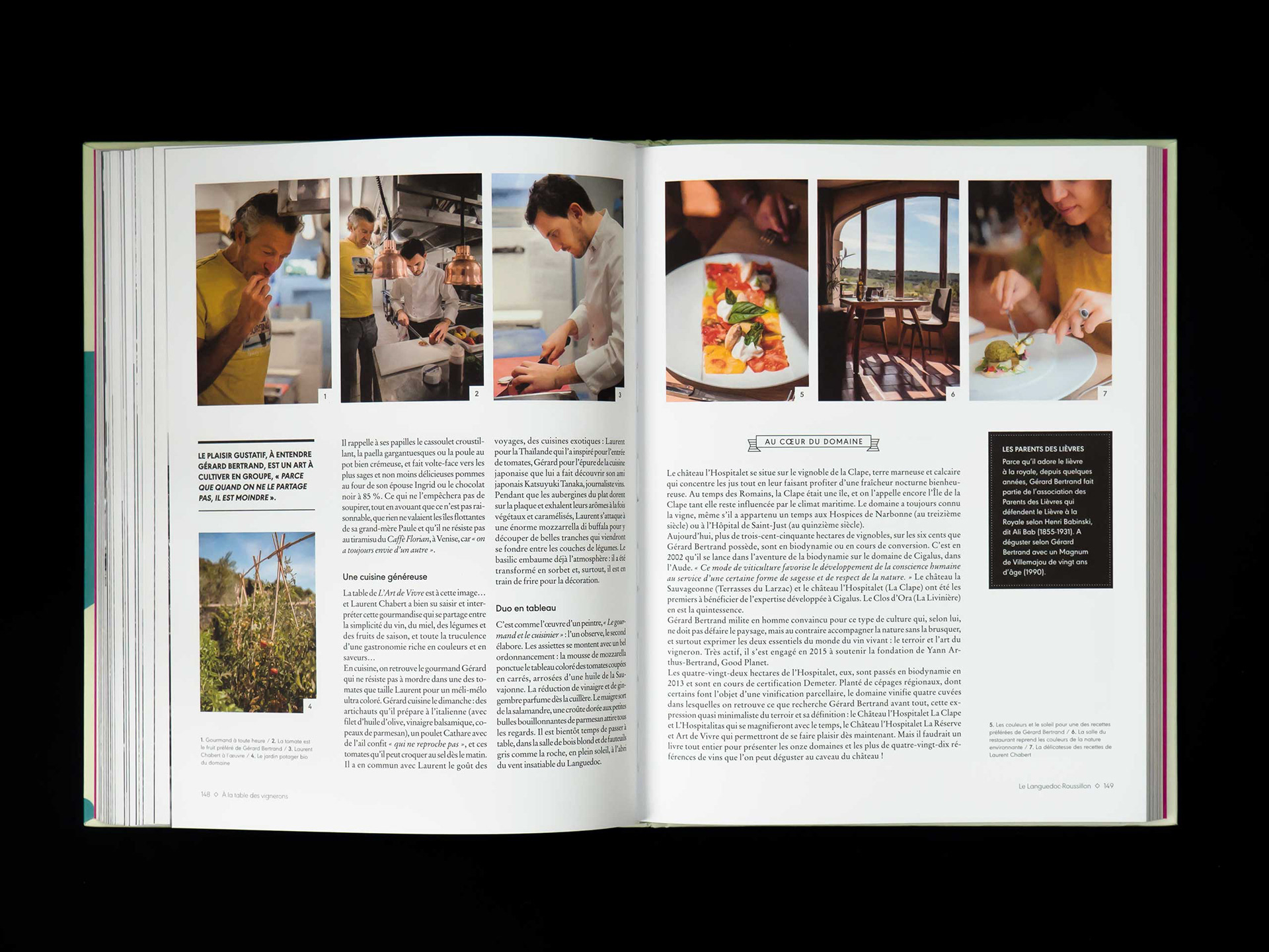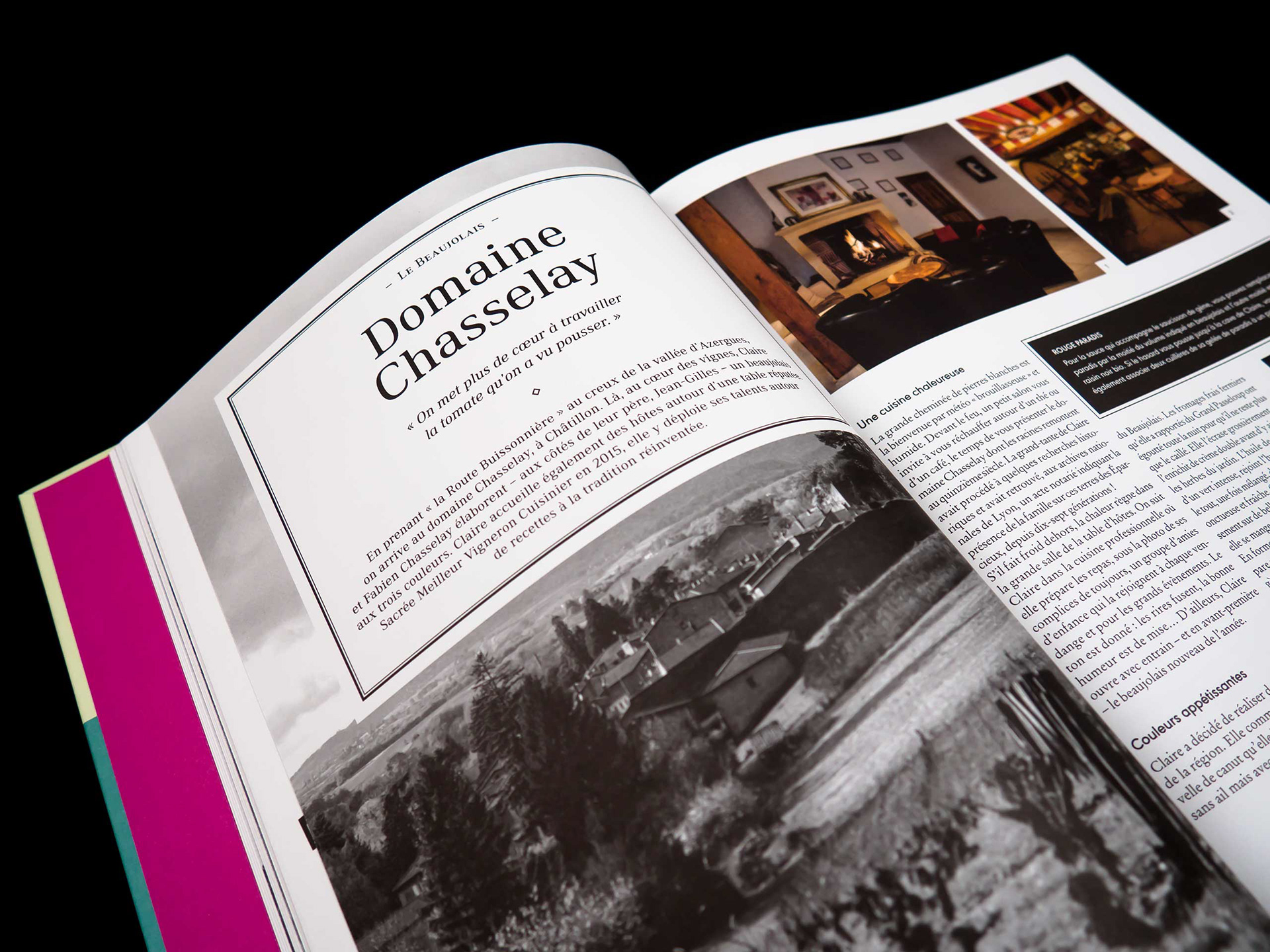 Conception et réalisation de la mise en pages d’un carnet de voyage gastronomique autour de la vigne. Relié cartonné, 256 pages.