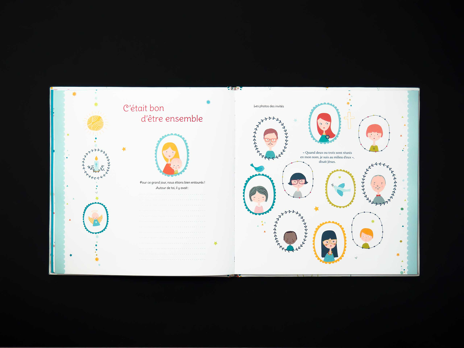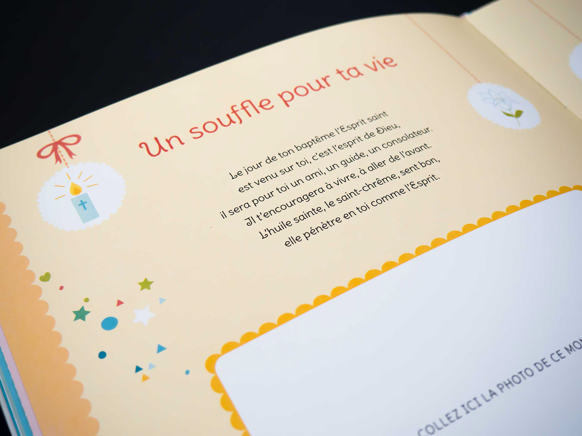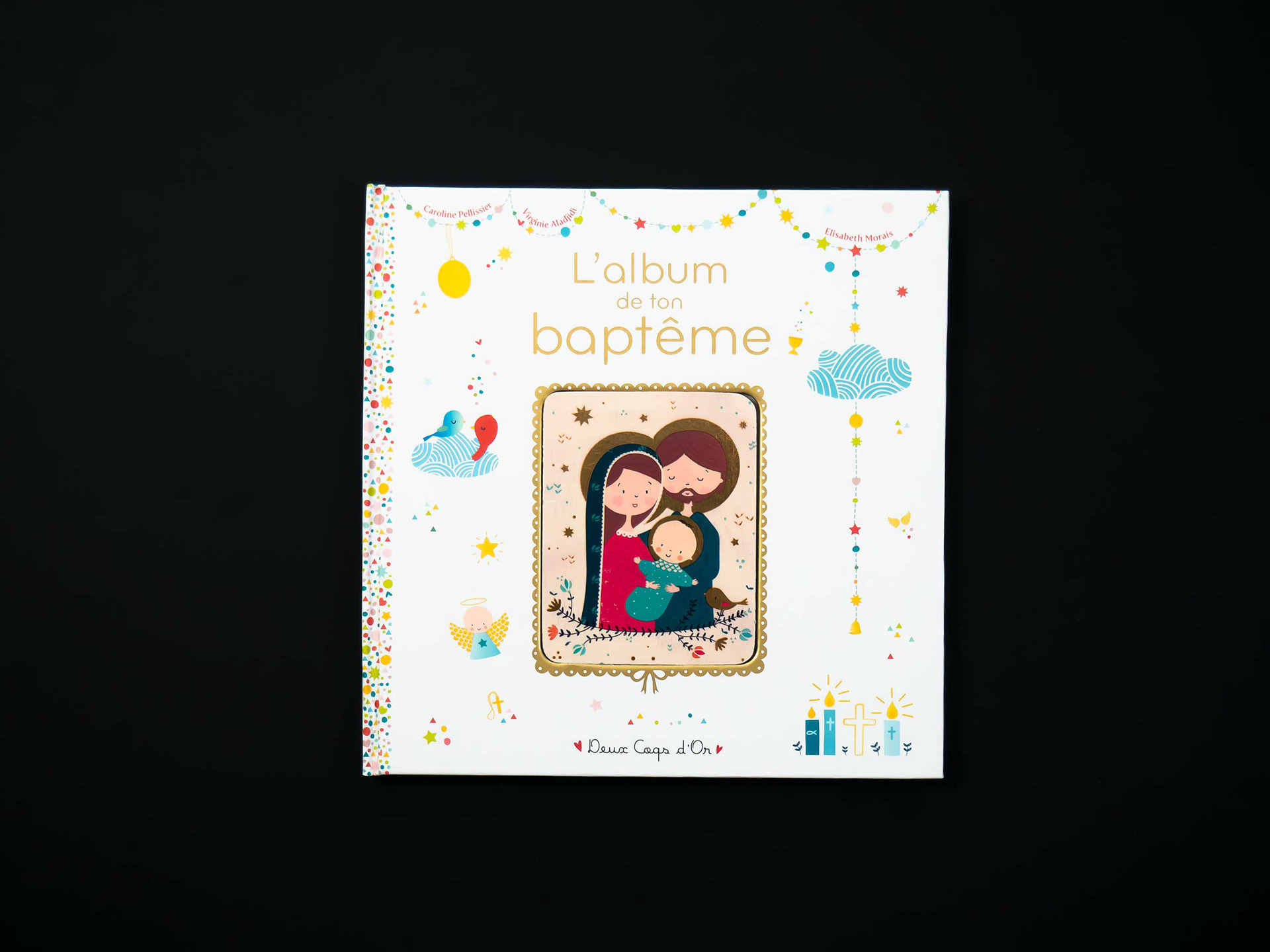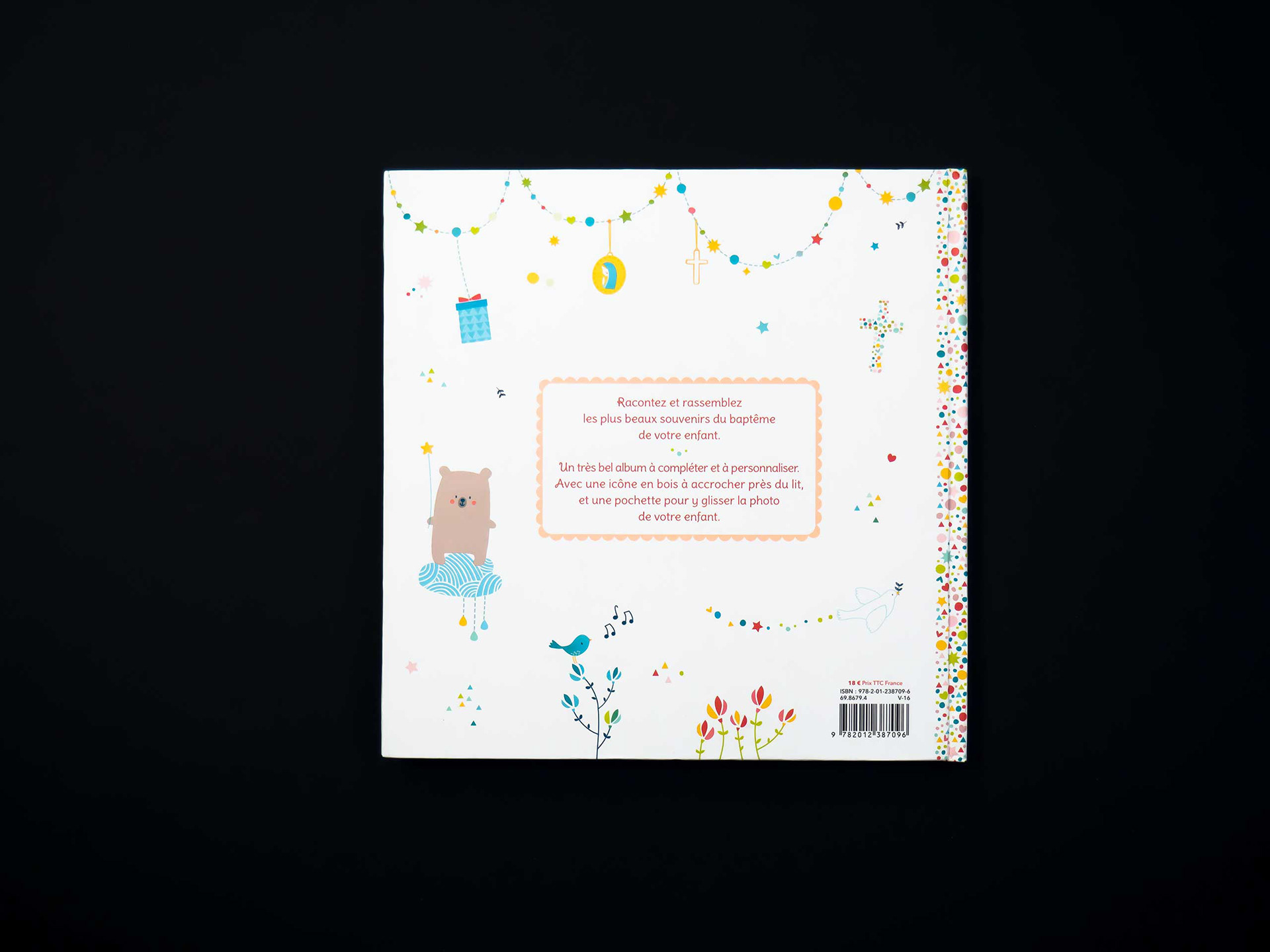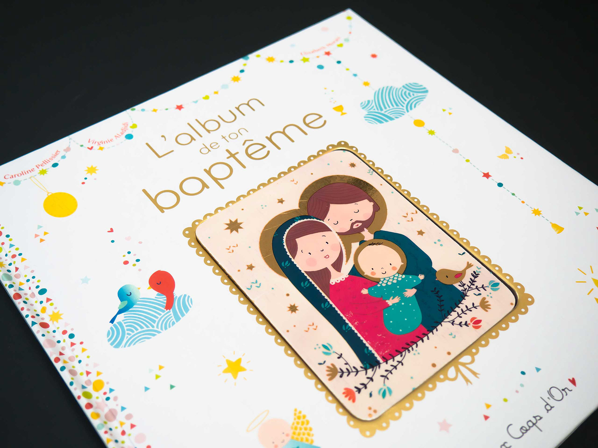 Album de baptême à remplir. Conception et réalisation de la mise en page et de la couverture. Relié cartonné avec fer à dorer et icône en bois détachable à accrocher.