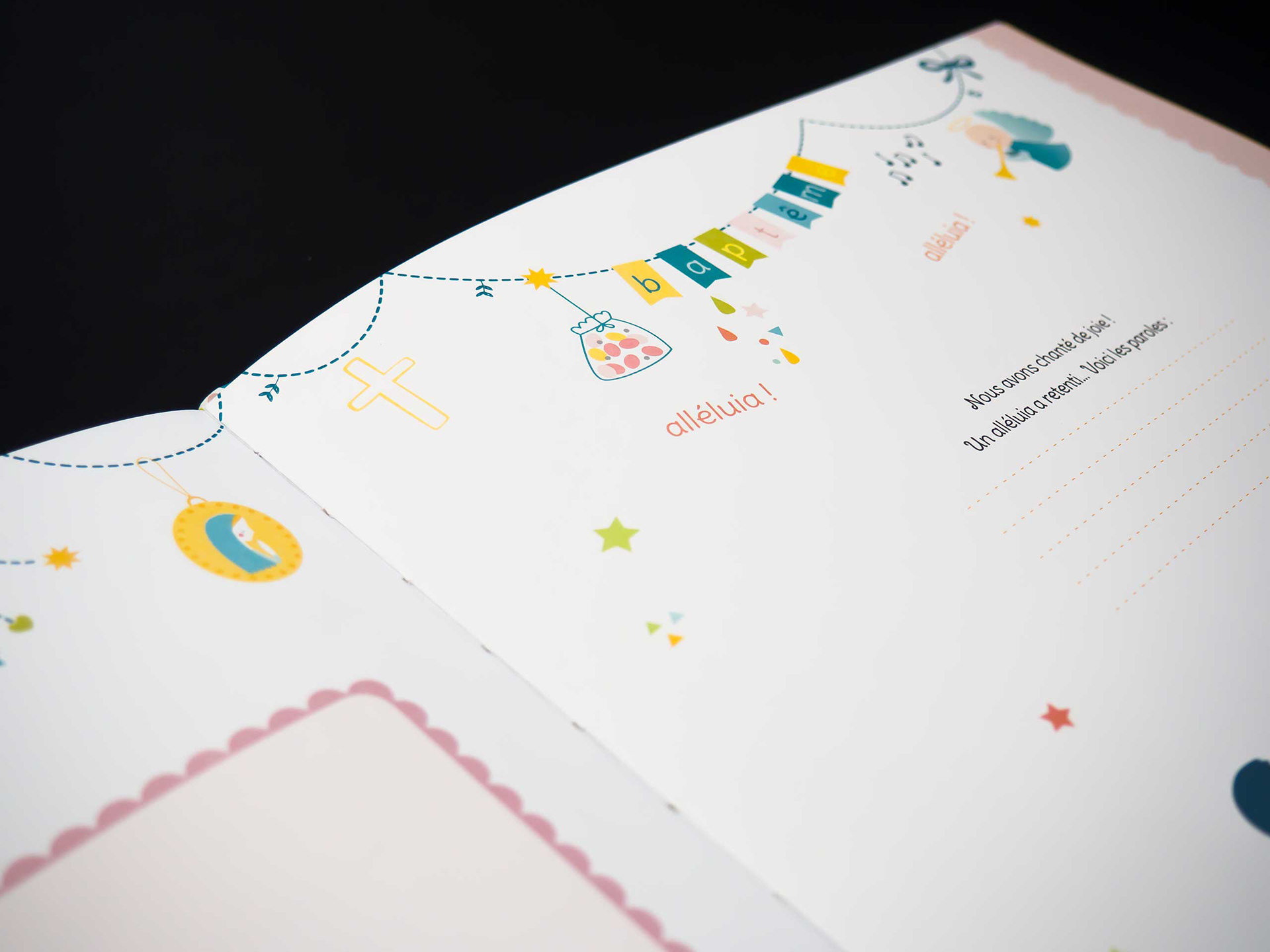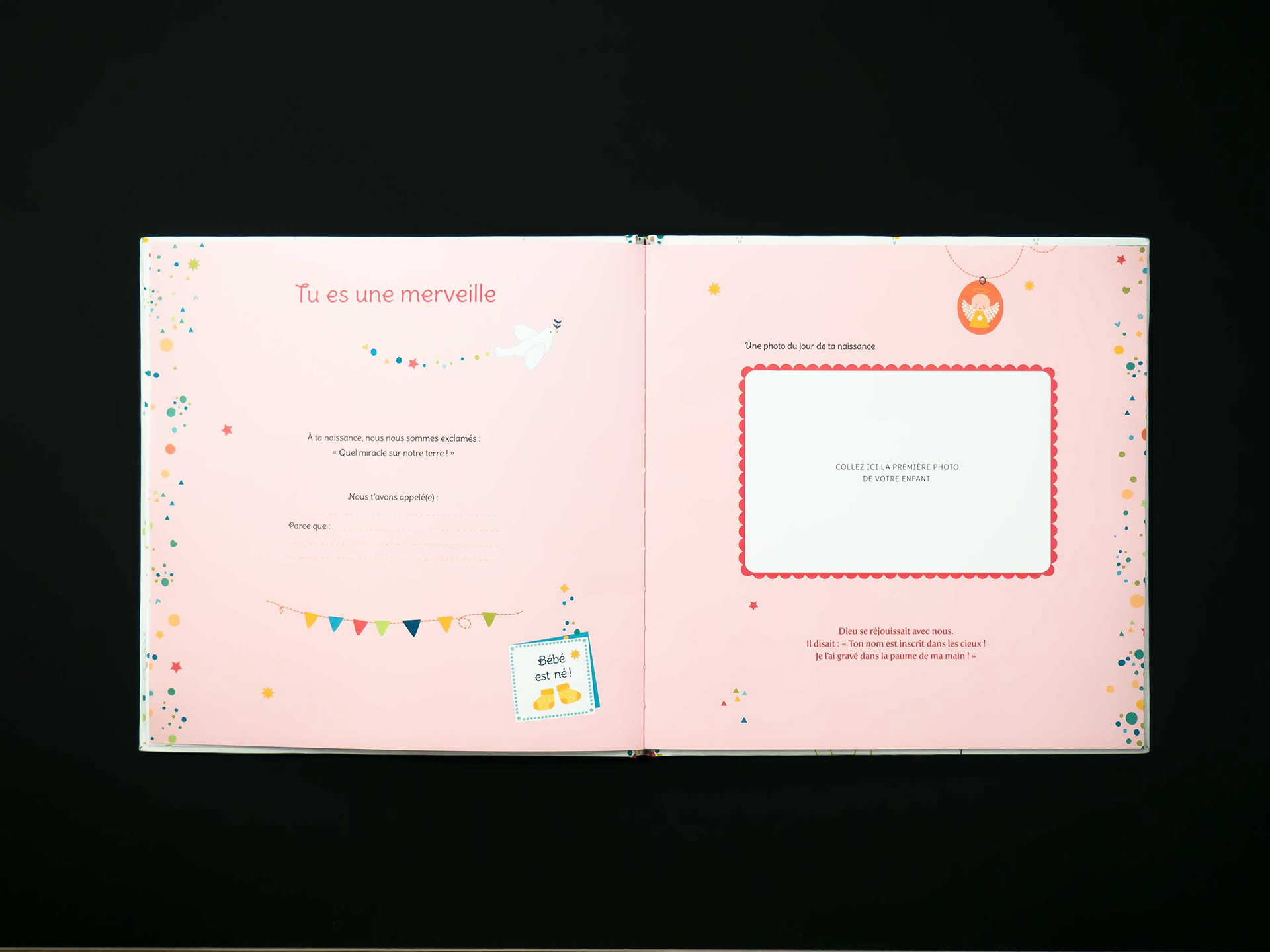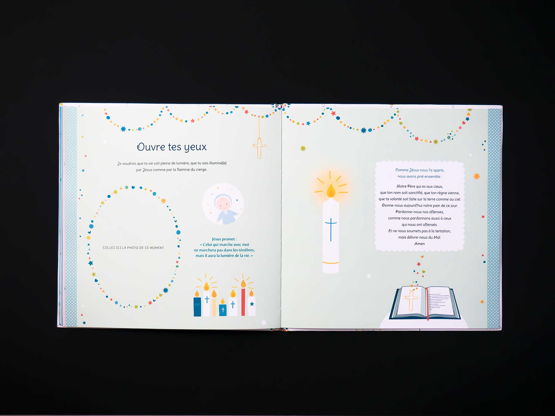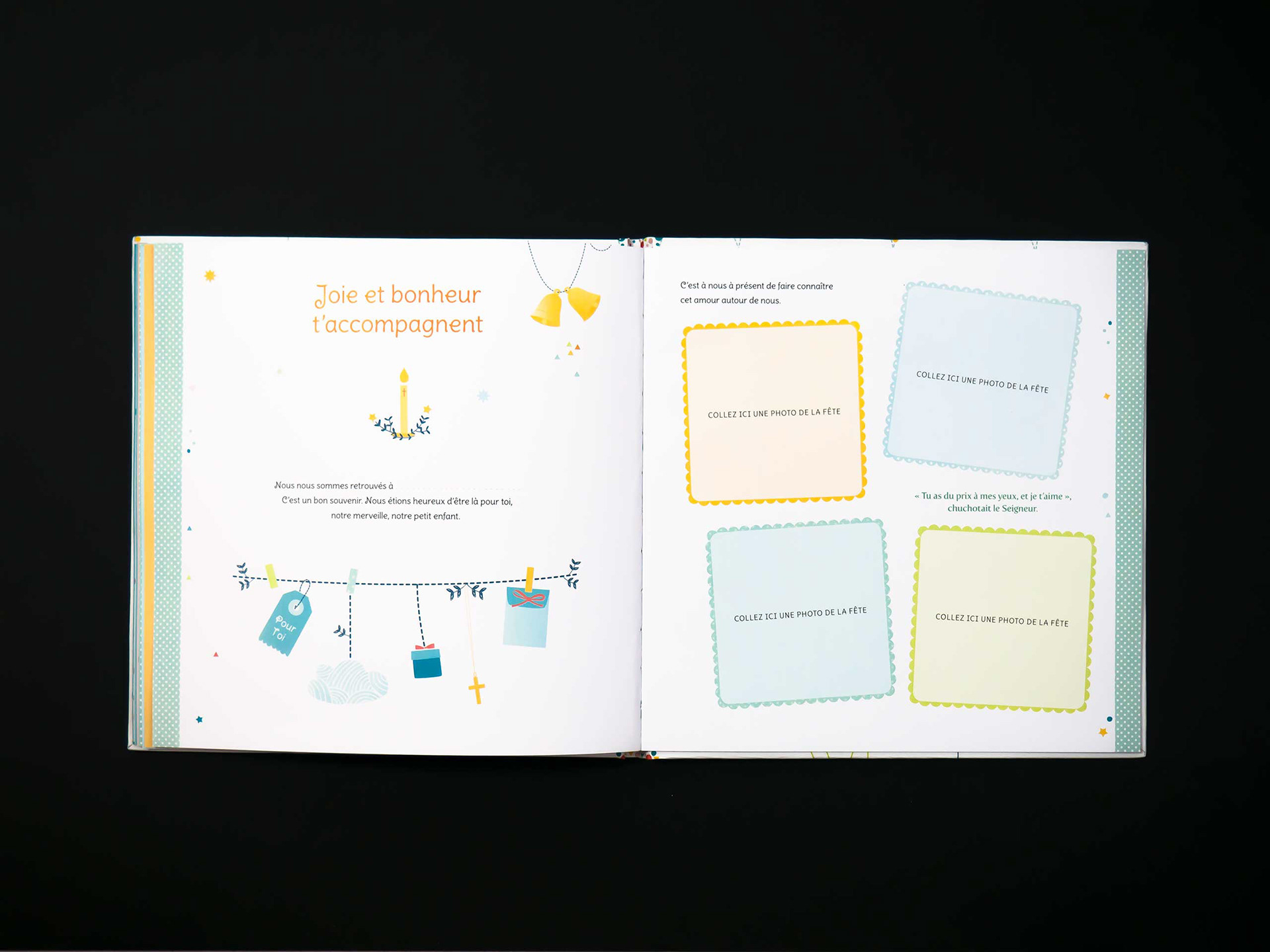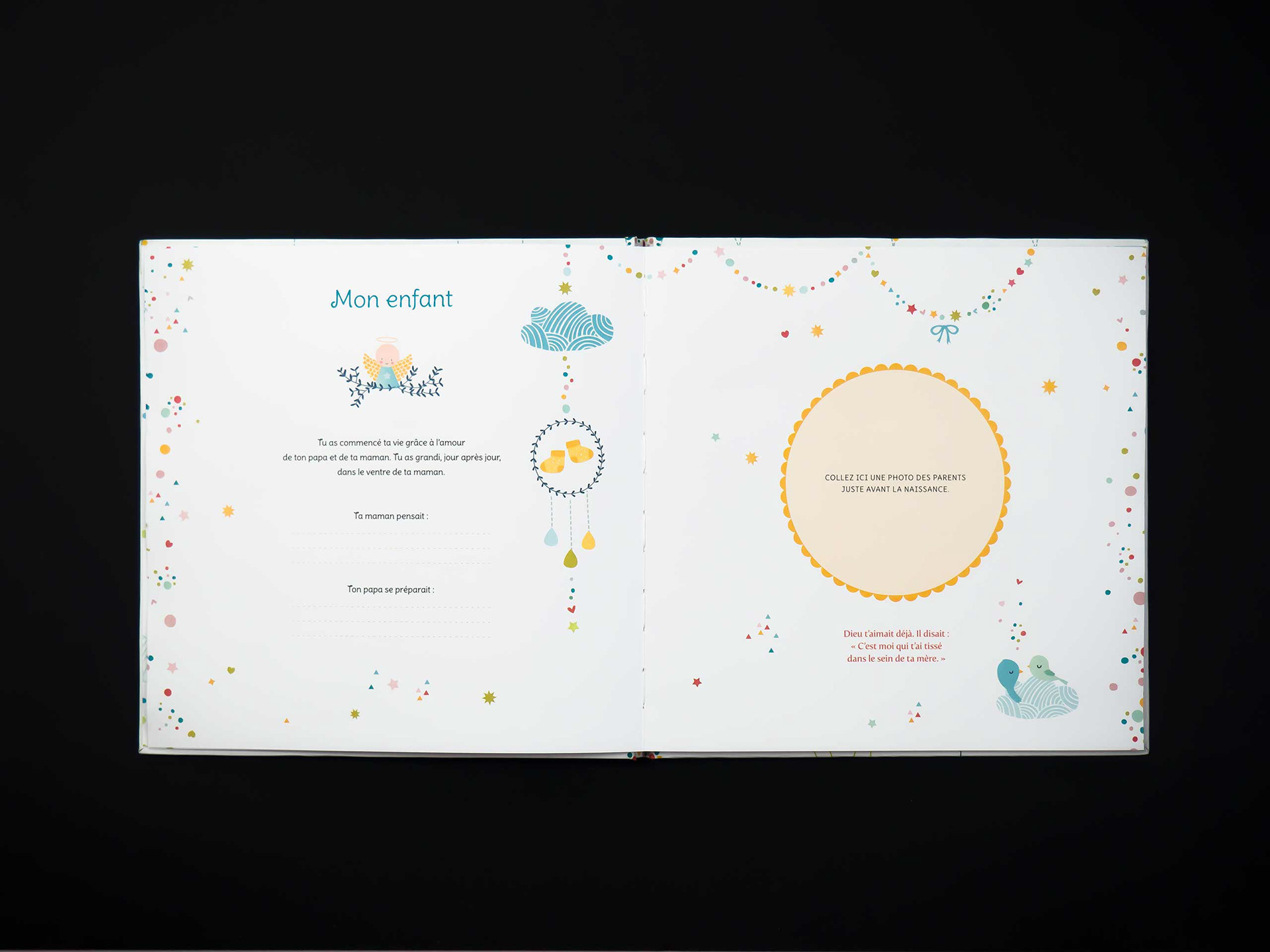 Album de baptême à remplir. Conception et réalisation de la mise en page et de la couverture. Relié cartonné avec fer à dorer et icône en bois détachable à accrocher.