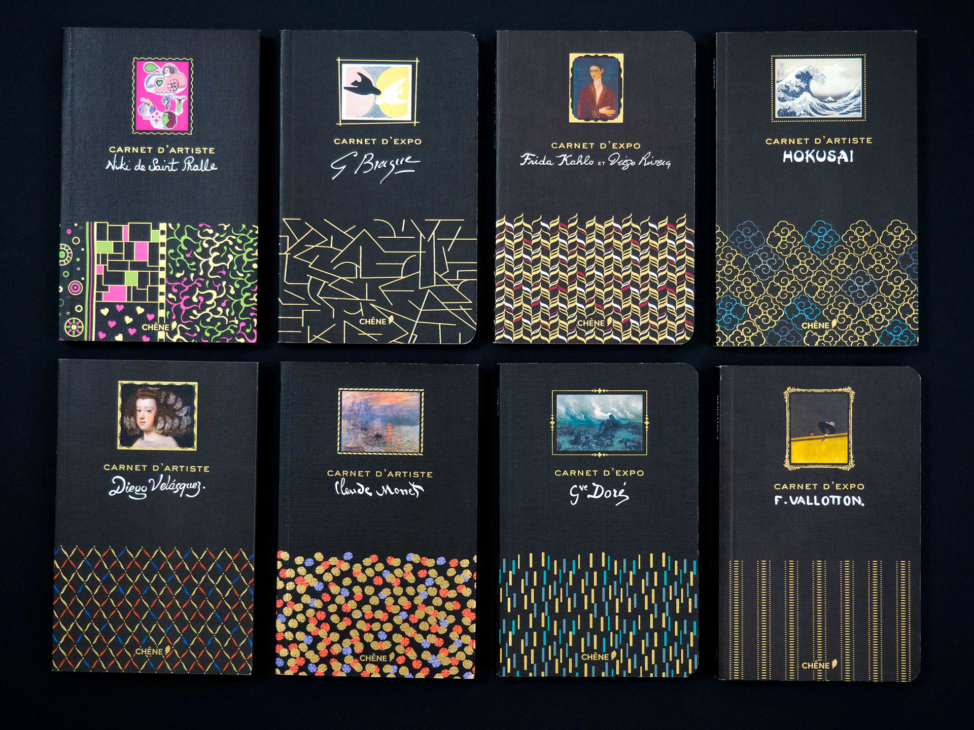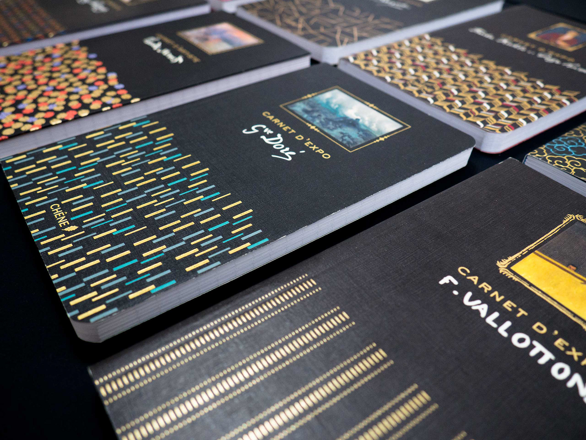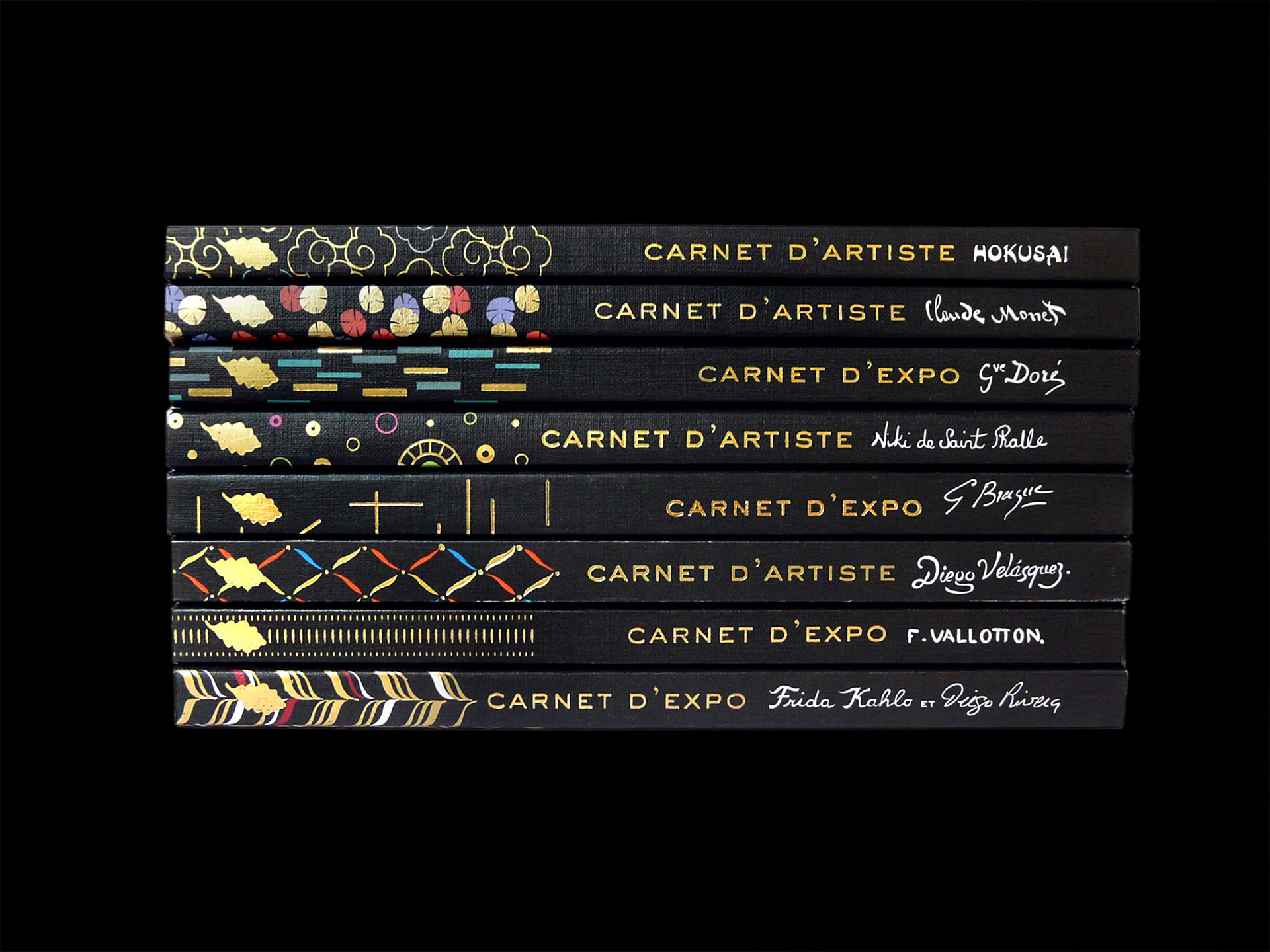 Collection de papeterie inspirée de l’actualité artistique parisienne. Conception et réalisation des couvertures et bandeaux. Fer à dorer sur Geltex texturé, broché à coins ronds et bandeau offset.