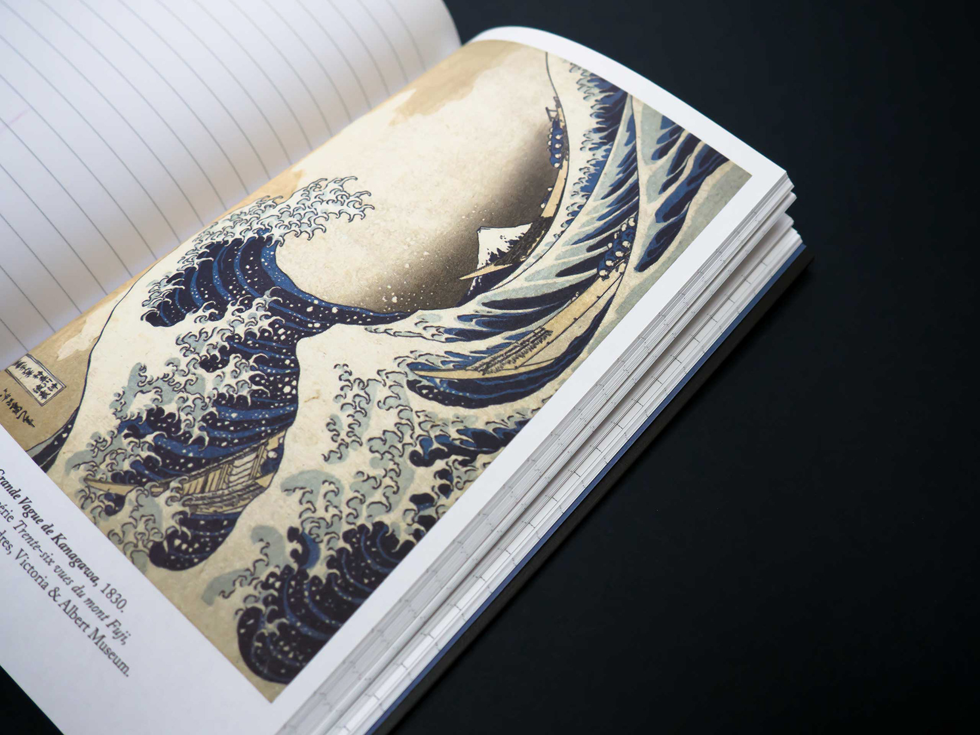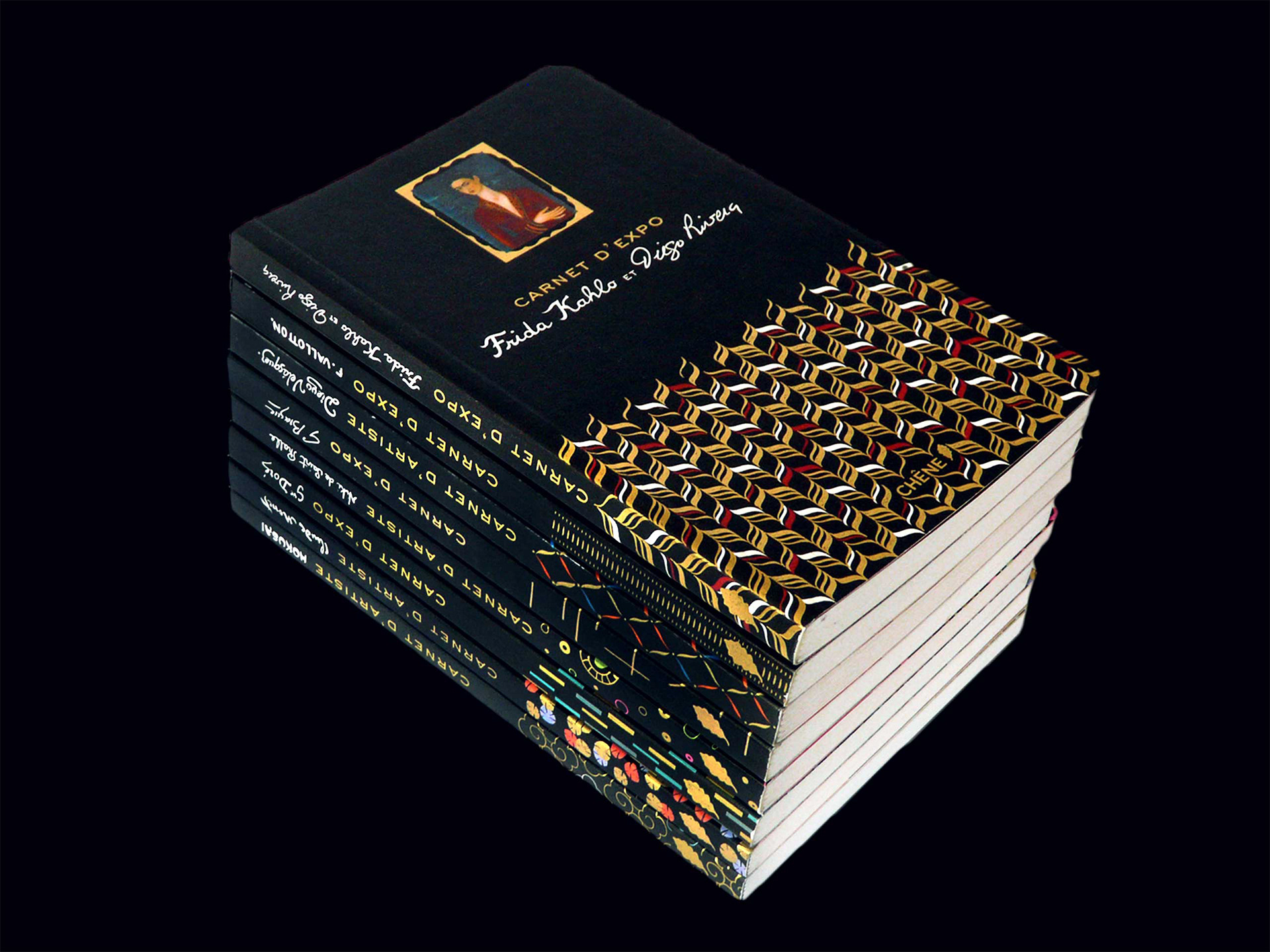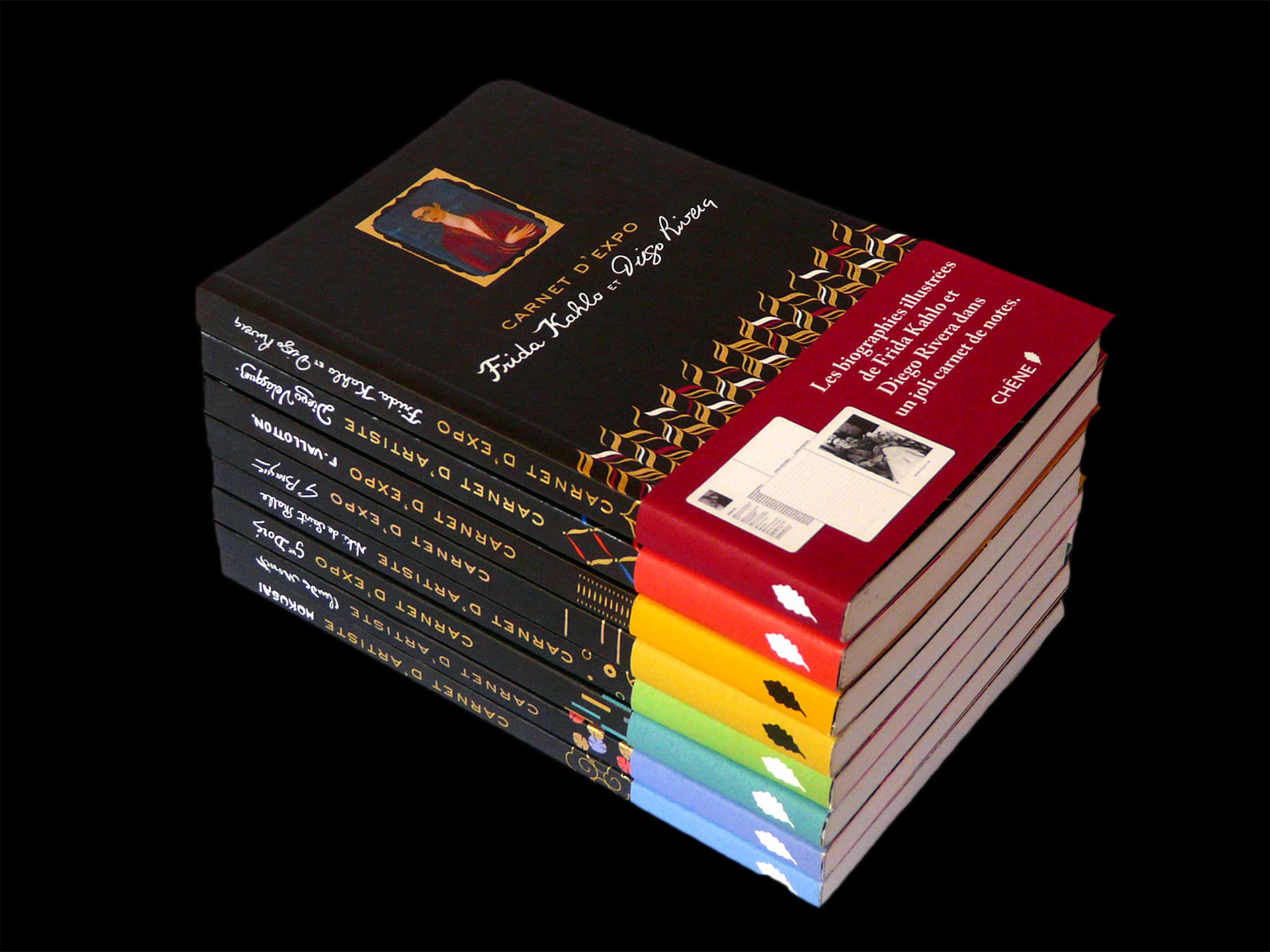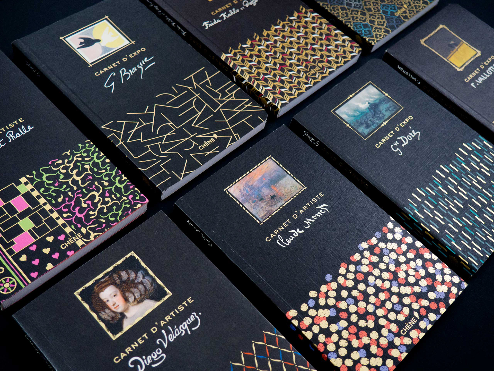 Collection de papeterie inspirée de l’actualité artistique parisienne. Conception et réalisation des couvertures et bandeaux. Fer à dorer sur Geltex texturé, broché à coins ronds et bandeau offset.