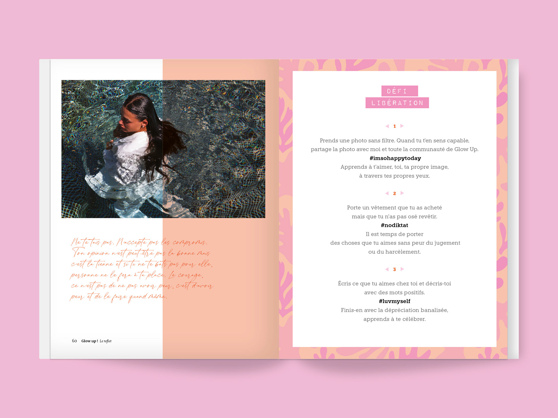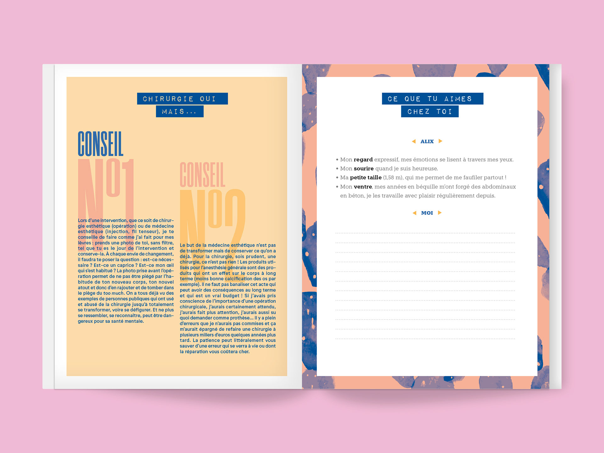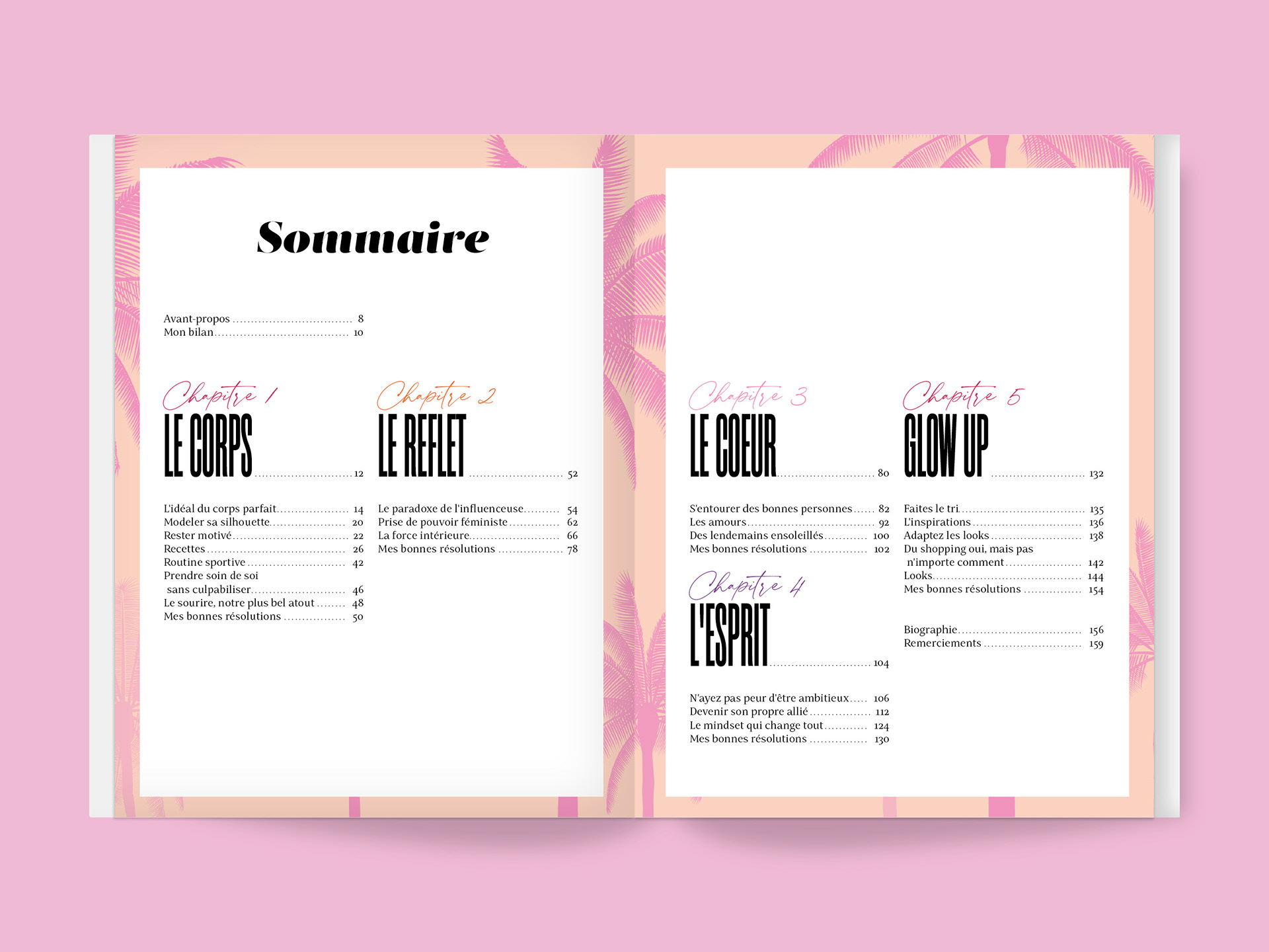 Le parcours et les conseils bien-être d’Alix Desmoineaux, ex-candidate de téléréalité, aujourd’hui influenceuse engagée. Conception et réalisation de la mise en page et de la couverture. Broché, fer à dorer rouge et vernis sélectif, 160 pages.