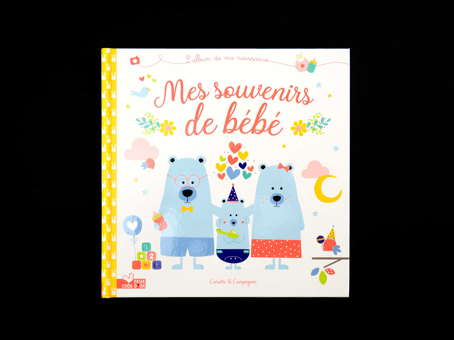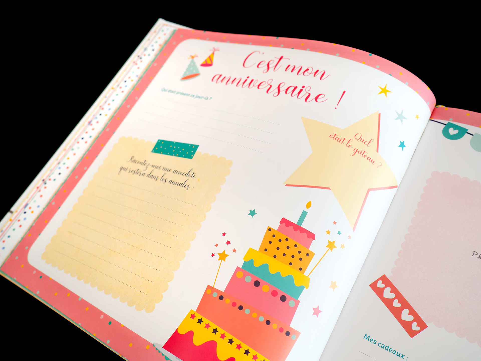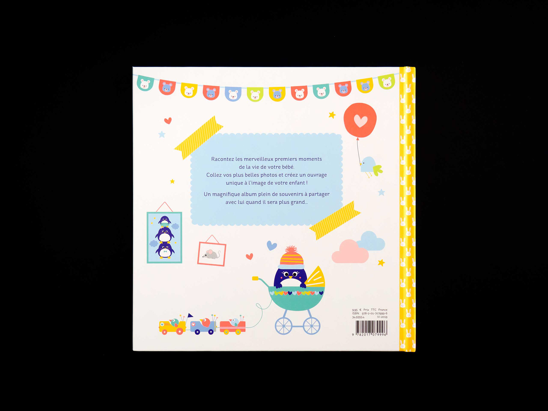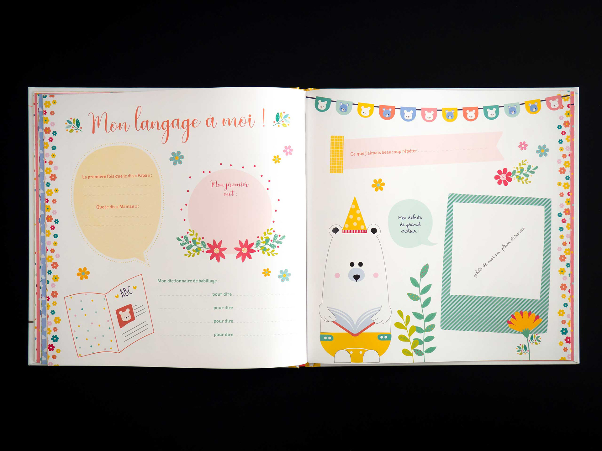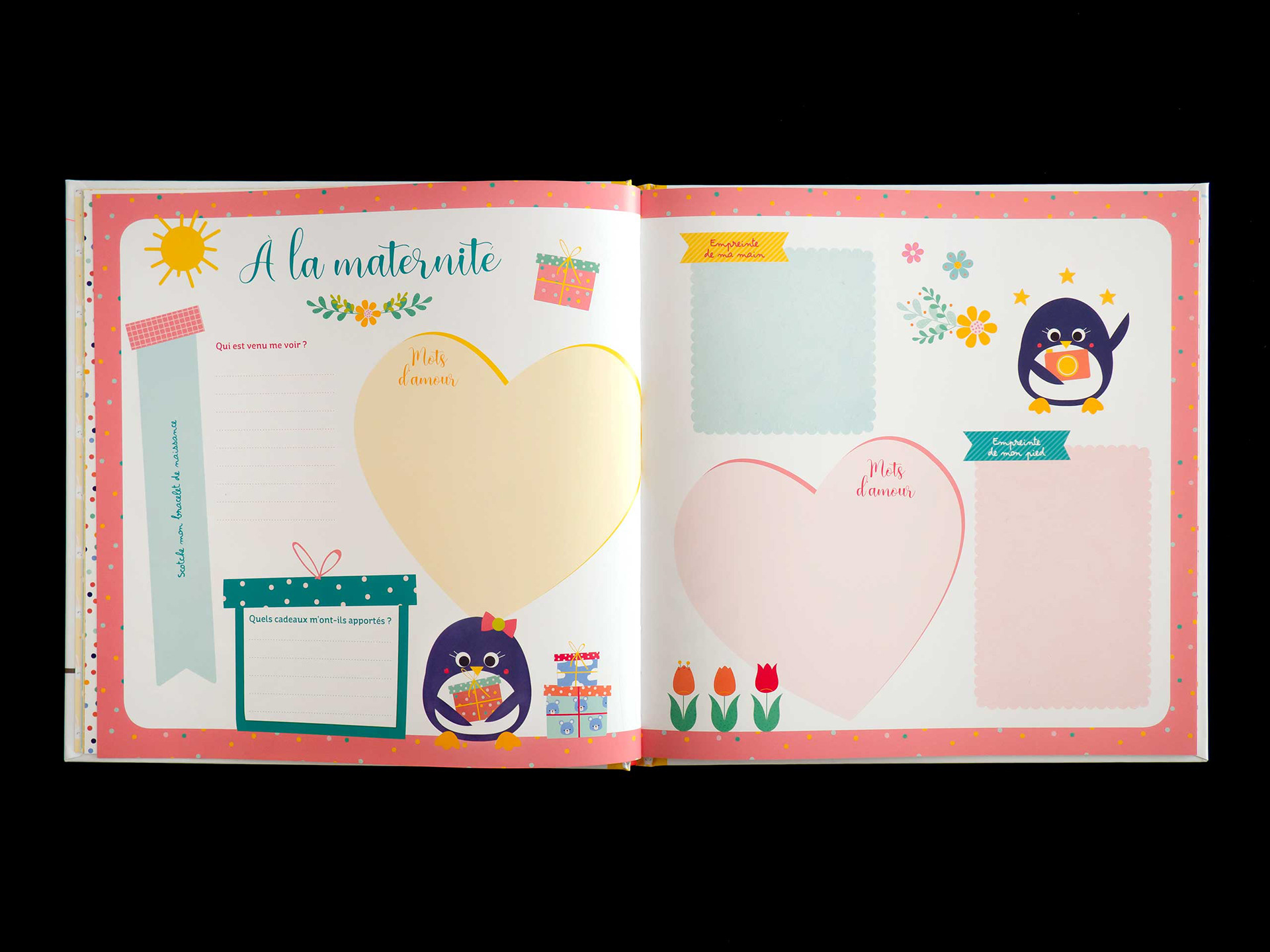 Album de naissance illustré à personnaliser. Conception et réalisation de la mise en page et de la couverture. Relié cartonné et Pantone fluo, 48 pages.