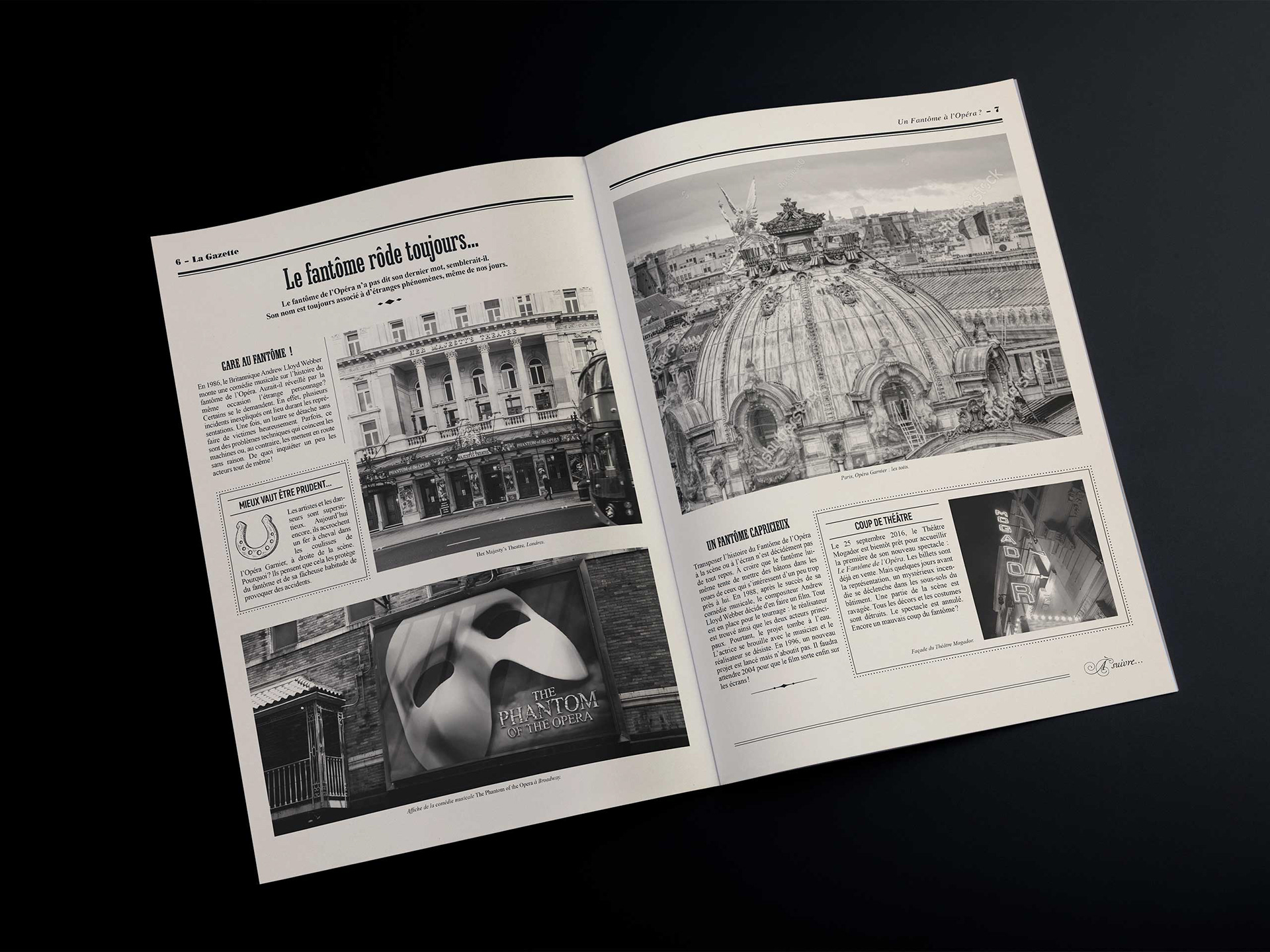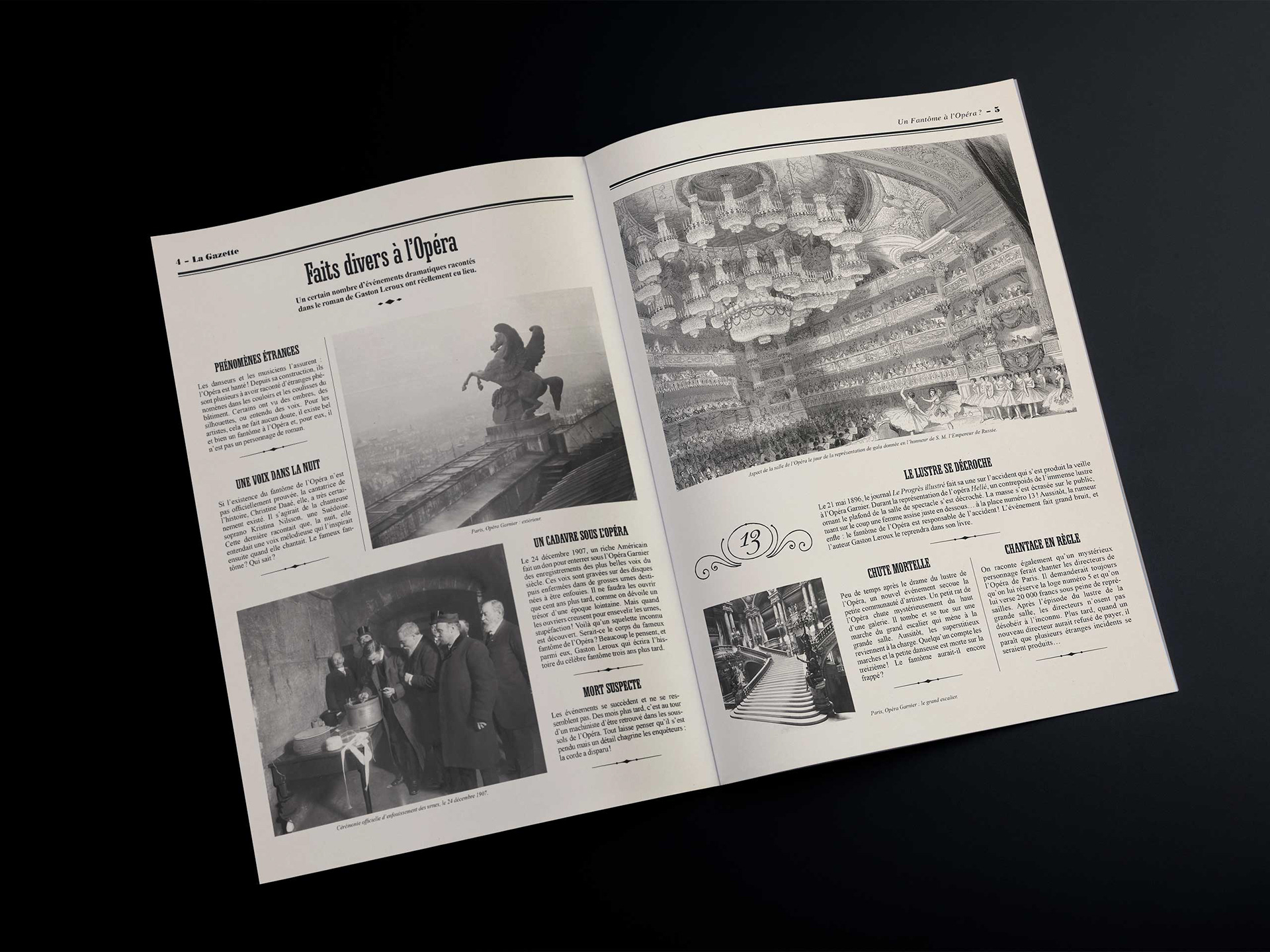 Gazette accompagnant un livre-CD sur la légende du fantôme de l’Opéra Garnier. Conception et réalisation de la mise en page. Piqûre à cheval, 8 pages.